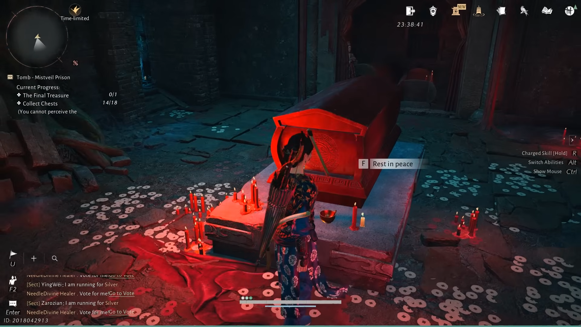 Step 2: Walk along this upper path toward the red coffin. Unlike earlier visits, the coffin now has a lid. Interact with it and choose the “Rest in peace” option. A progress bar fills, and once complete, a message indicates that mist has lifted somewhere.