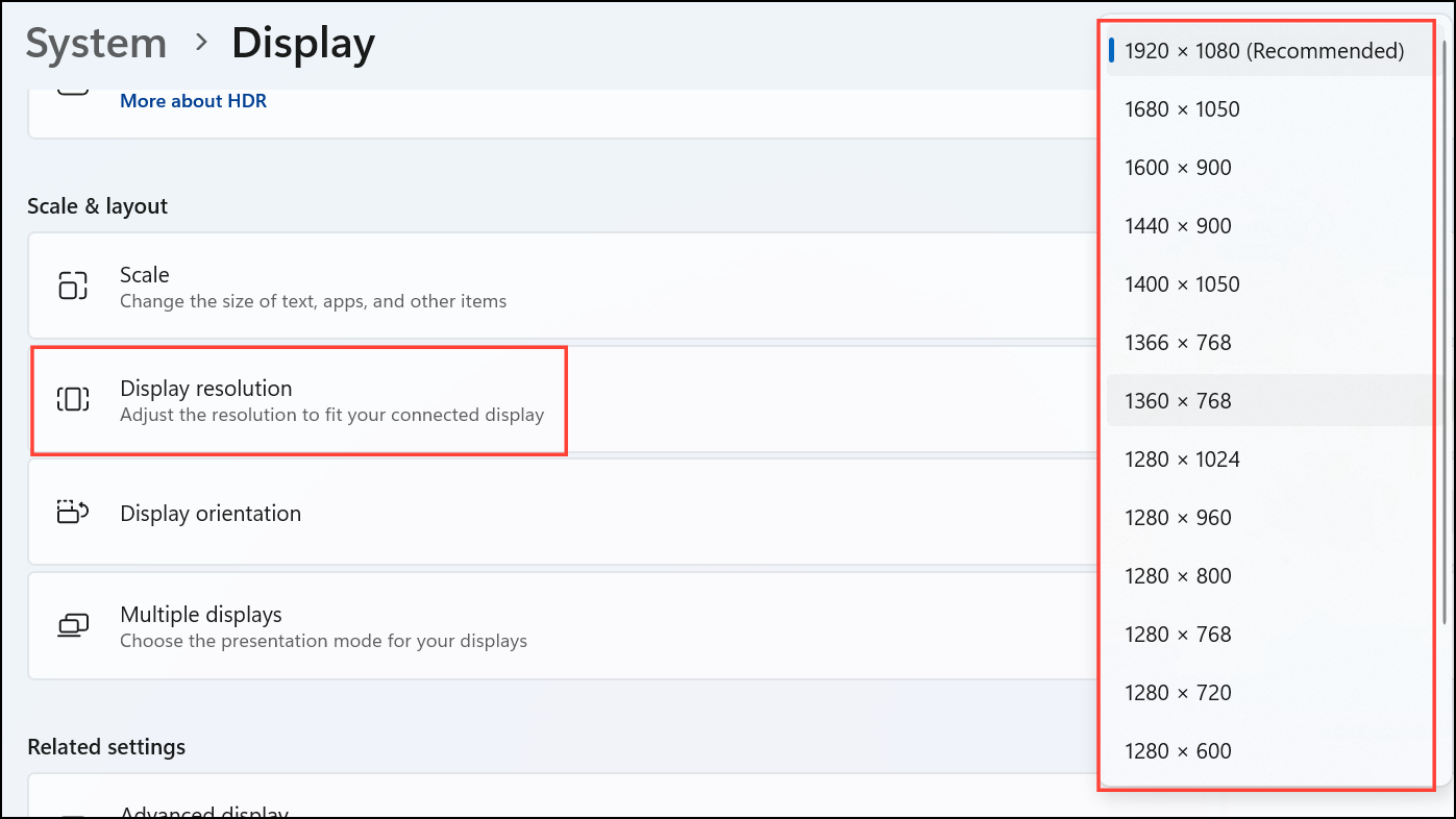 Step 2: Scroll to the “Display resolution” section and temporarily switch to a different resolution. This can force hidden windows to reposition themselves onto the visible desktop area.