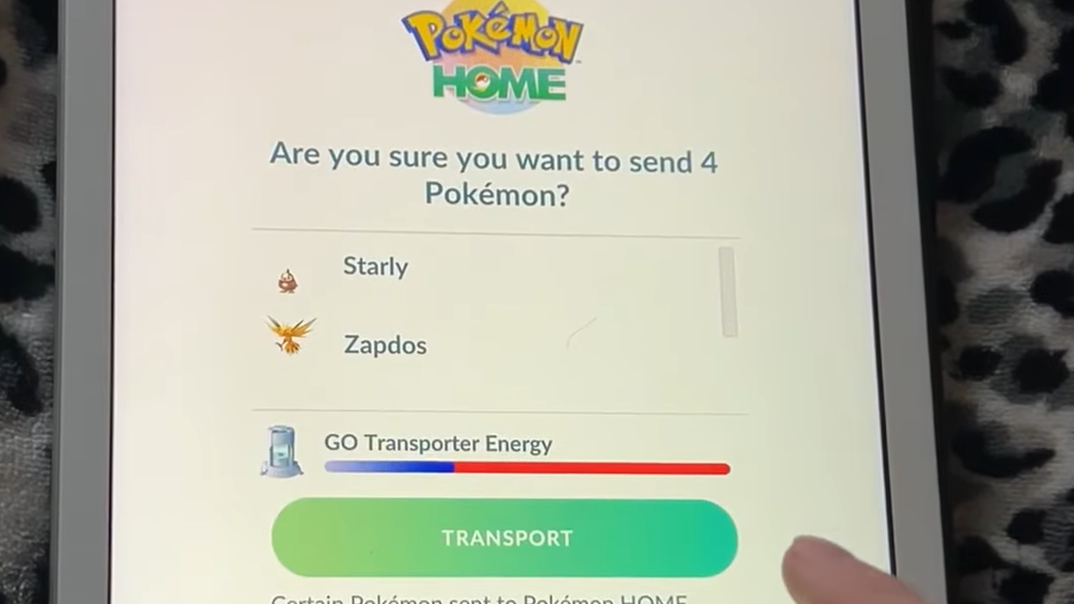 Step 4: Review the summary screen showing which Pokémon will be sent and how much energy the transfer will cost. If everything looks correct, tap Transport.