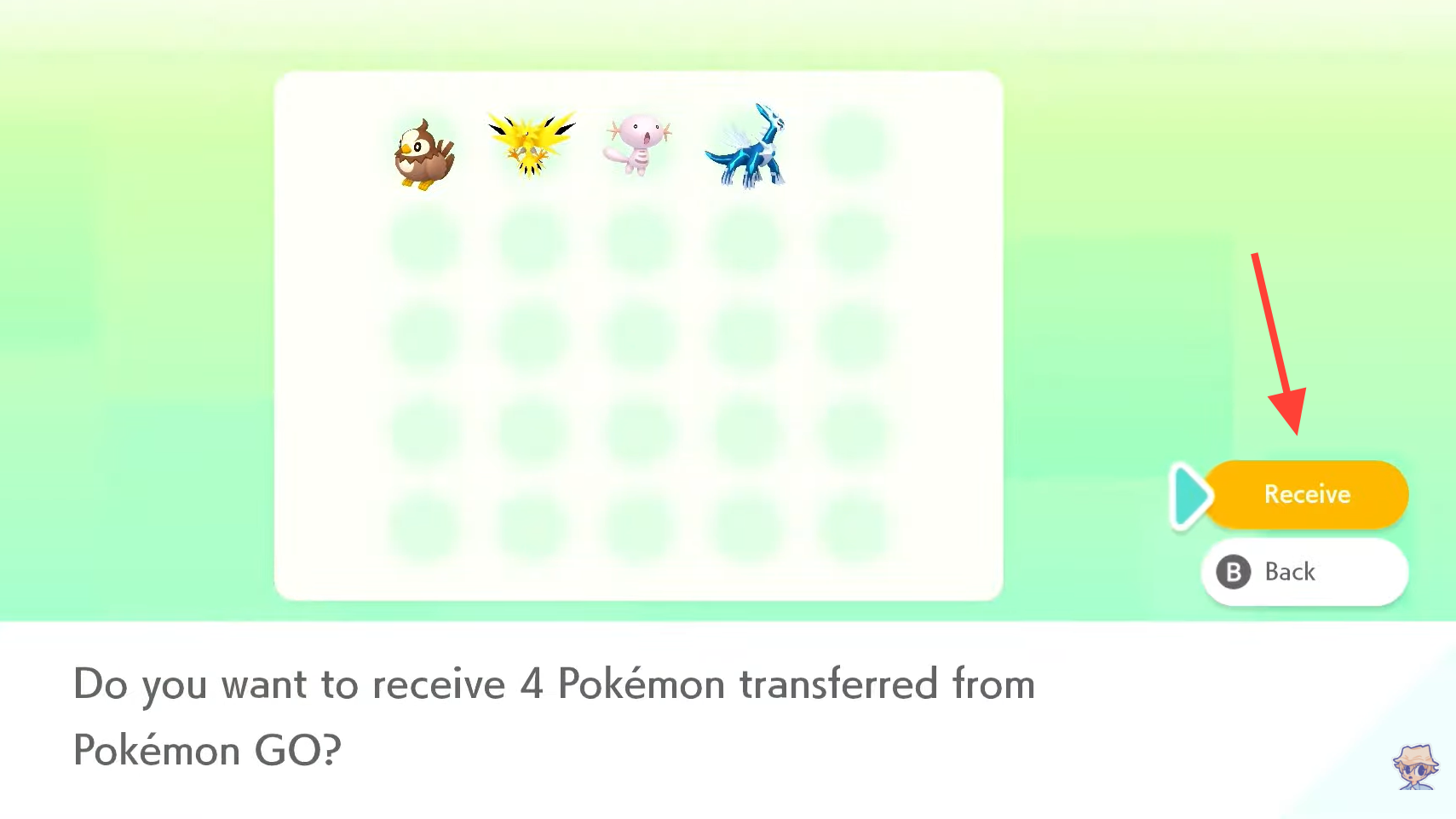Step 2: If a pending transfer exists, select Receive to move the Pokémon into your Boxes.