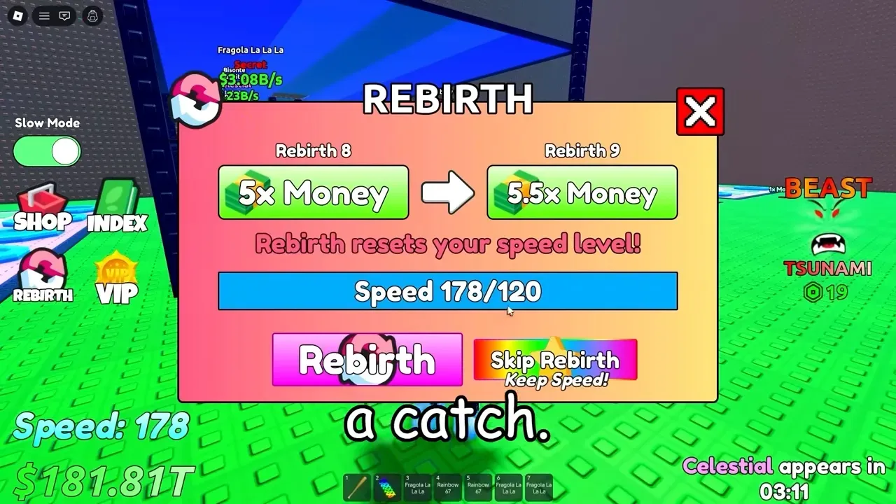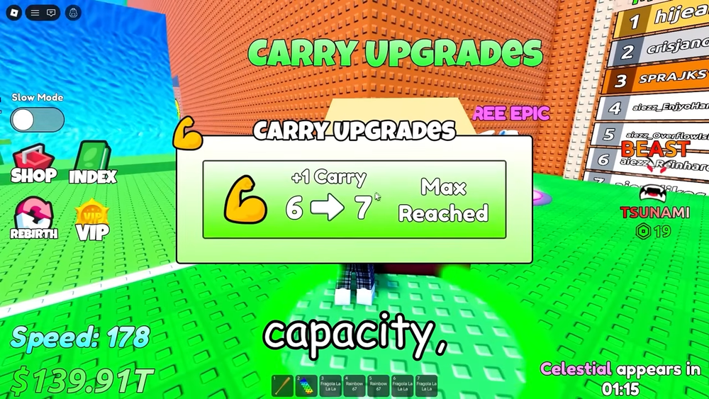 Step 4: Farm slow and super slow waves for high‑rarity Brainrots. Use Carry Upgrades to bring back multiple Secrets, but play safely around Celestial spawns by returning as soon as you secure one.