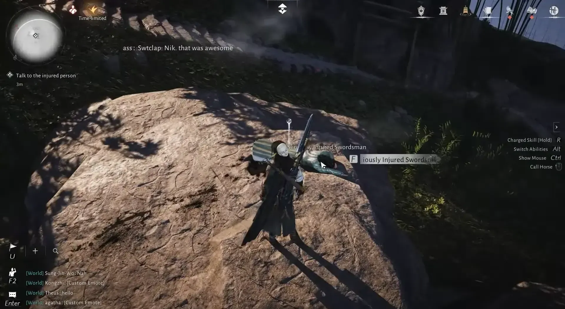 Step 3: Travel to Halo Peak and look for a seriously injured swordsman lying in that area, somewhat northwest of the nearby boundary stone. Speak to him and then follow the trail of blood he leaves behind.