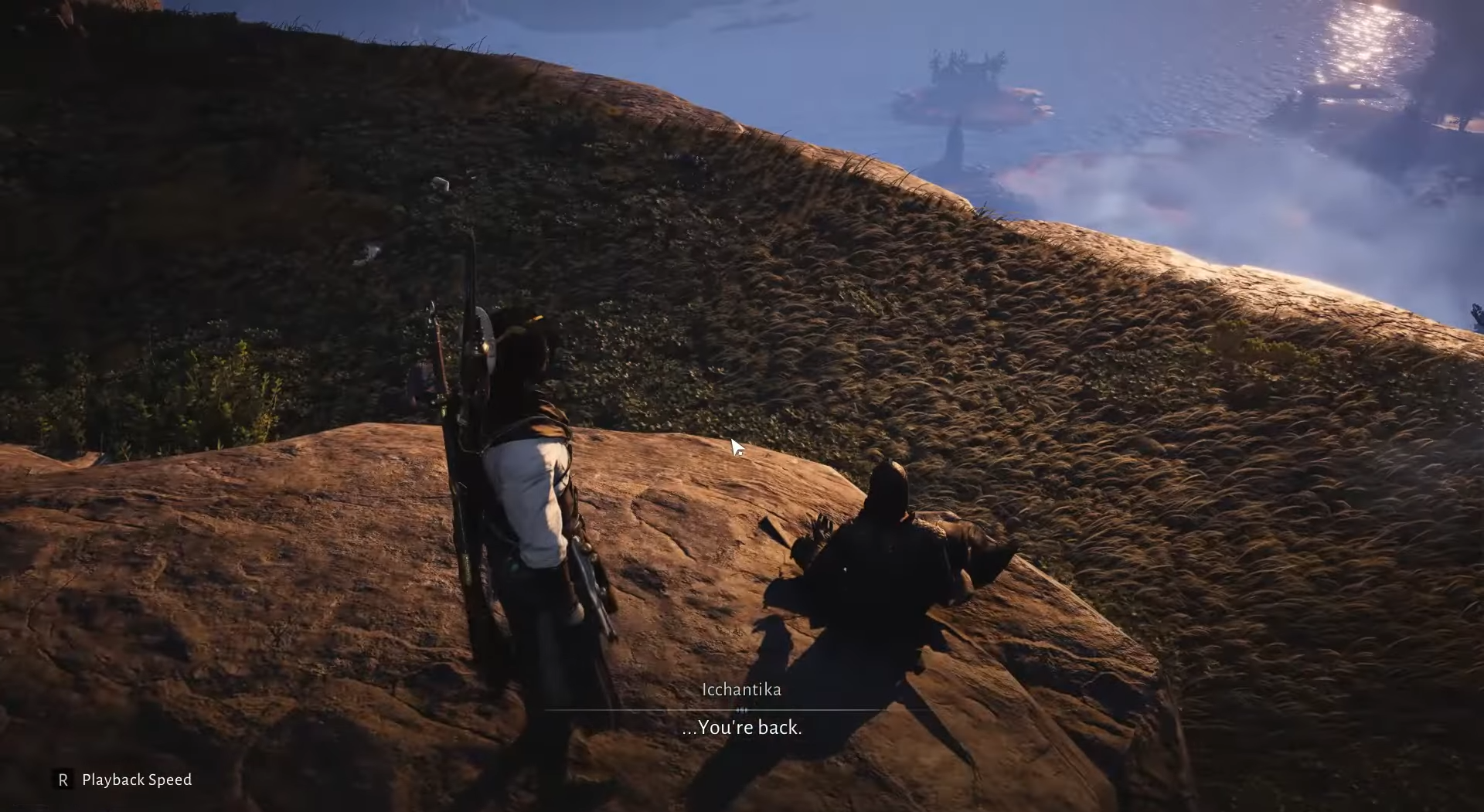 If you approach without attacking, he speaks in short lines that imply he is waiting for someone specific and that your character is not the person he expects. The mood is closer to a wandering elder or assassin on pilgrimage than to a generic enemy or quest marker.
