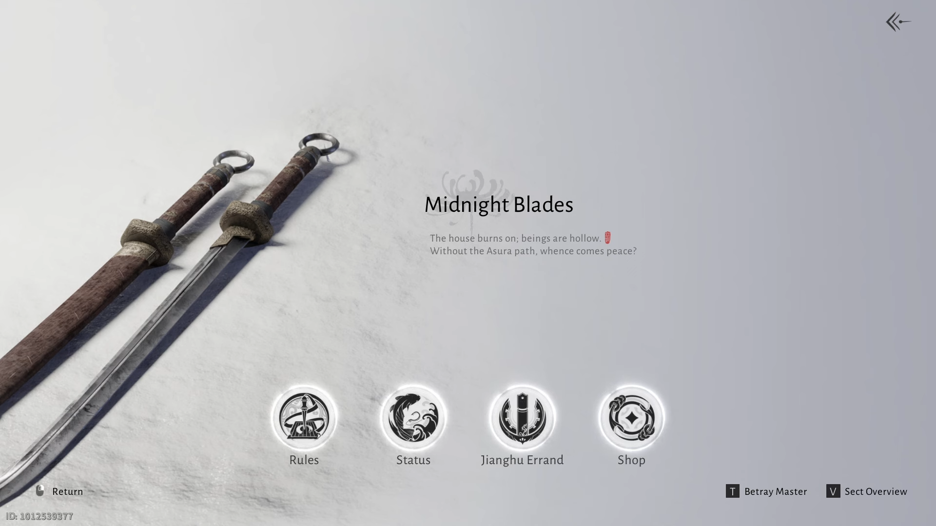 The Midnight Blades sect presents itself as a brotherhood of assassins who embrace the Asura path, a life defined by killing. Sect rules and activities revolve around hunting other wanderers, collecting Karma Points through combat, and treating death as a cost of their chosen path.