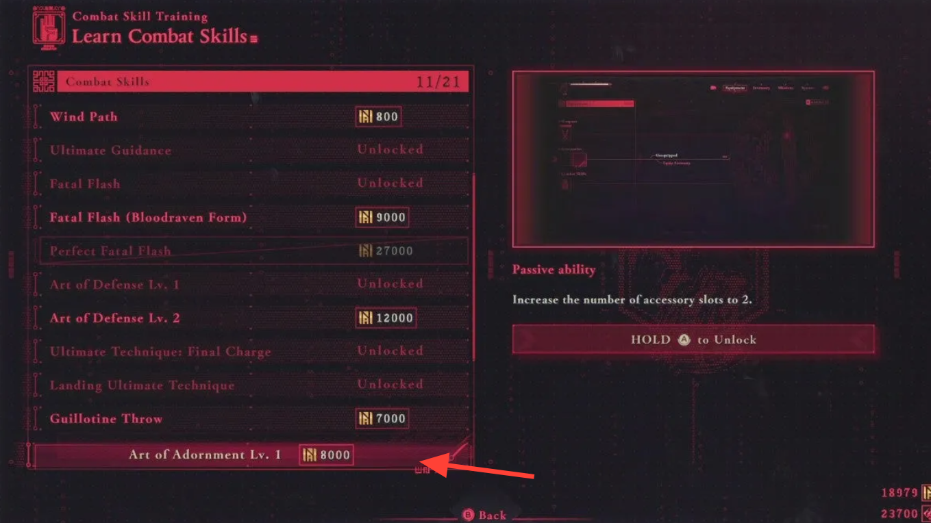 The first expansion to your accessory capacity is a paid upgrade that becomes available in Chapter 4: Pilgrim’s Windswept Path. Visit a DarkNest Terminal and summon Tyran (his raven perches at terminals) to access his Combat Skills shop. There you’ll find a new entry: