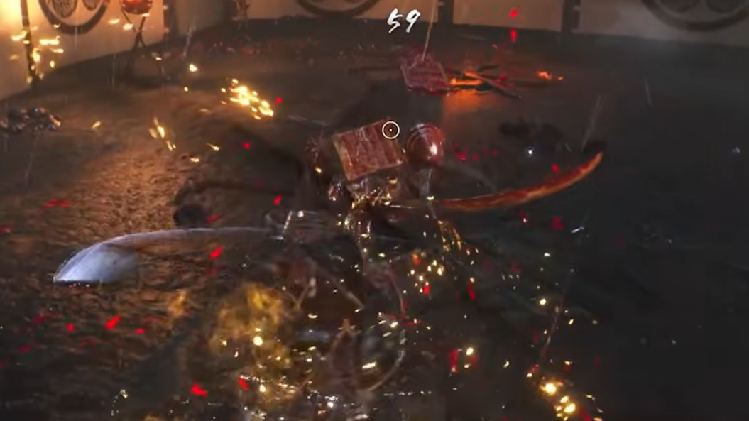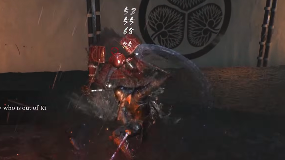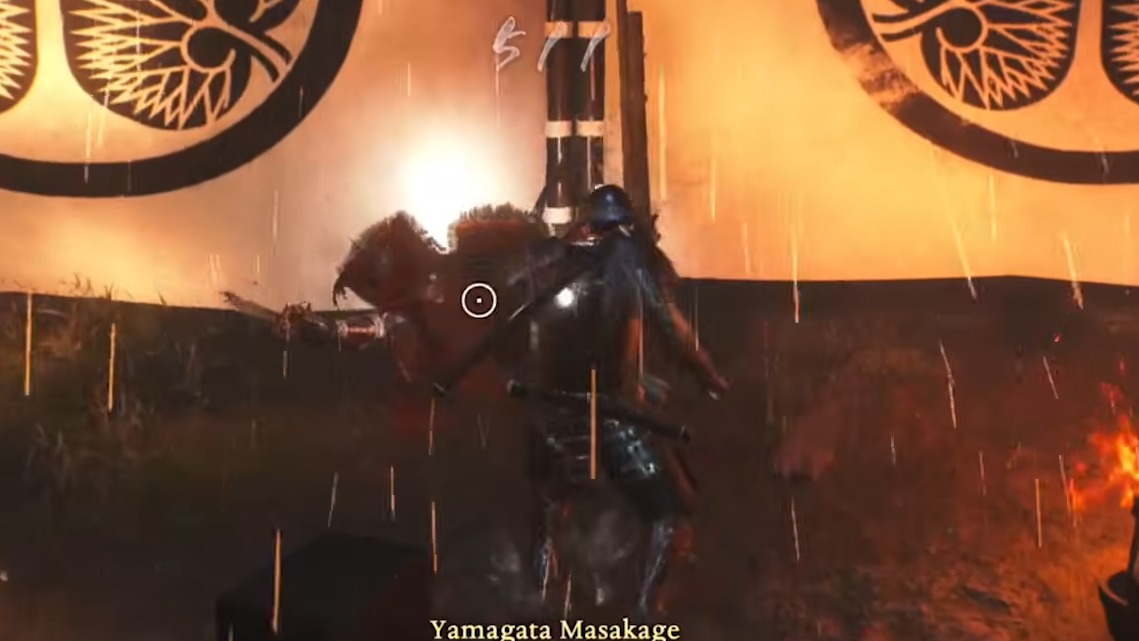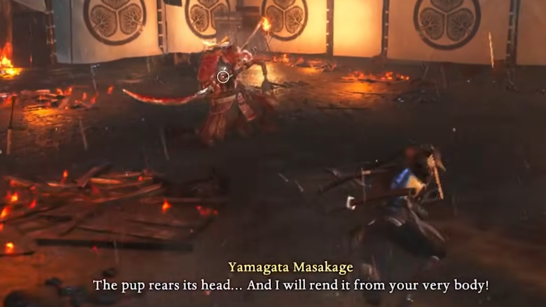 When Yamagata glows red, he's charging a Burst attack — typically the spinning low sweep into an overhead slam that follows his whirlwind swipe. Counter it by pressing R2 (PlayStation) or RT (Xbox) to switch styles at the right moment. A successful Burst Break stuns him, drains a significant portion of his Ki, and opens a window for several free hits.