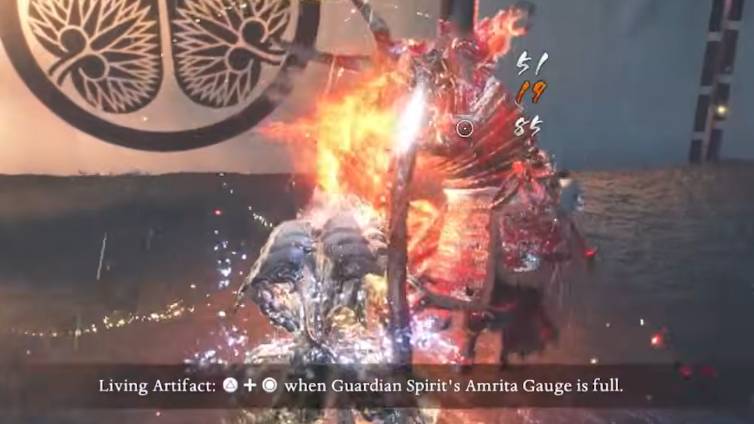 Once Yamagata drops to roughly one-third health, the game introduces the Living Artifact mechanic. Press Y + B (Xbox) or Triangle + Circle (PlayStation) to transform into a powered-up spirit form tied to your equipped Guardian Spirit. While in Living Artifact form, you deal massively increased damage, apply elemental damage based on your Guardian Spirit, and — critically — you are invulnerable. Getting hit will drain the gauge faster, but you won't lose health.