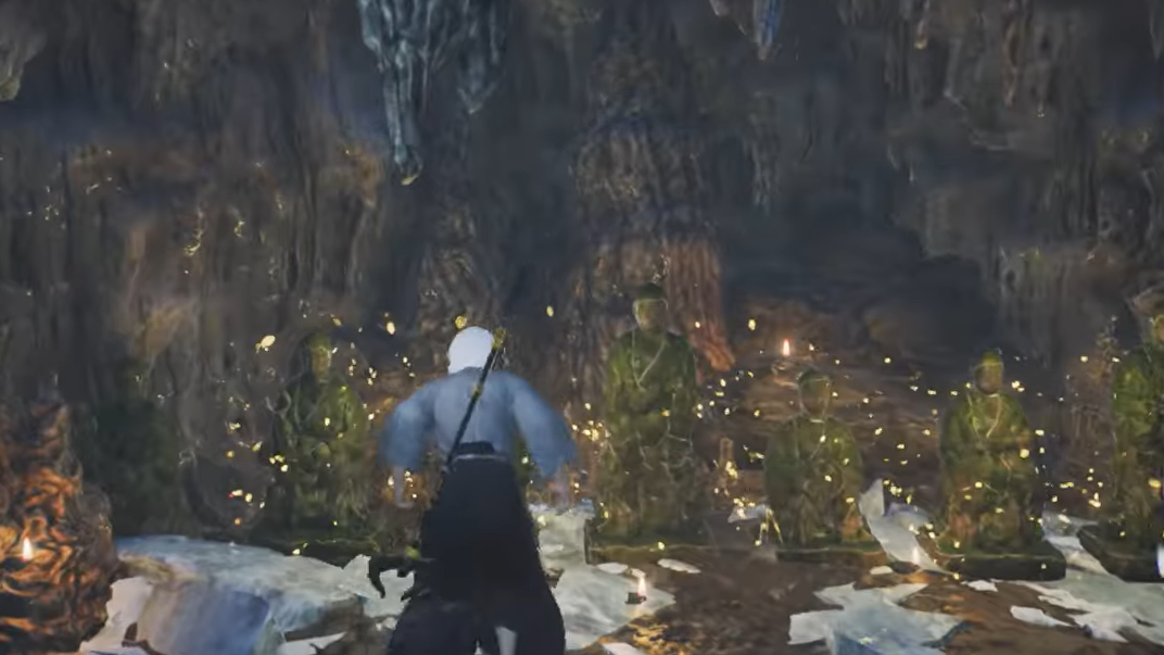 Step 3: Run straight through the fake wall scroll. It conceals a hidden passage leading to a small cave where the Six Jizo statues sit. Pray to collect your merit.