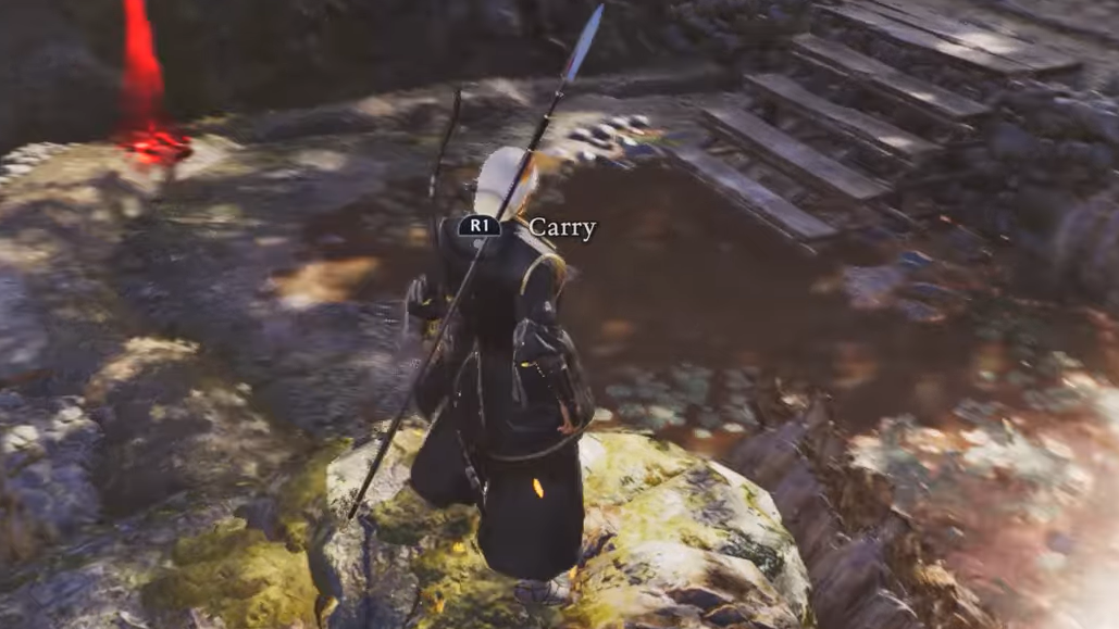 Once across the bridge, head up the hill toward the statue. There are a couple of dangerous enemies along the way. A Yokai perches on top of a rock near the path, and a water creature lurks further ahead. A Crucible Wraith may also be in the area, so approach with caution and clear enemies before attempting anything else. You need the area relatively safe because carrying the head back leaves you vulnerable.