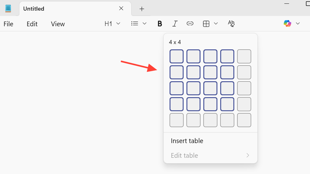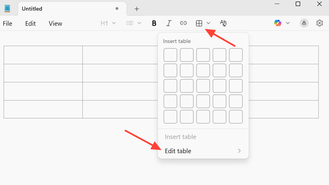 Once a table is in place, Notepad exposes extra controls under the same Table button.