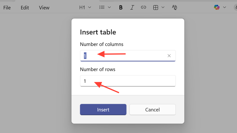 When you need a specific size or a larger table than the grid picker shows, switch to the dialog.