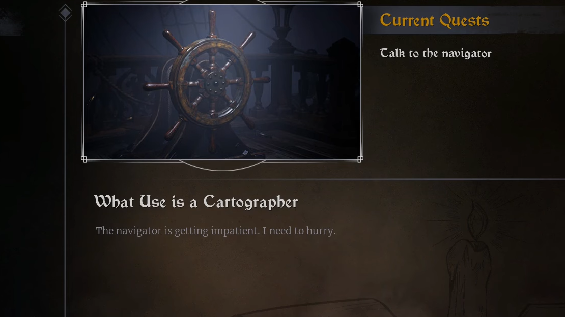 On the Starting Shores, you control Tristan, a cartographer who wakes up near a makeshift camp. Speaking with Sirdar right in front of you not only anchors the opening story beat, but it also kicks off the overall Hardships of Seafaring chain.