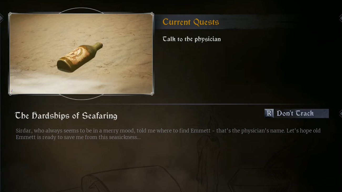 Step 1: After you gain control of Tristan on the beach, walk forward to Sirdar and speak with him. Tristan mentions seasickness, which prompts Sirdar to tell you to seek out the crew’s physician, Emmett. This conversation starts The Hardships of Seafaring.