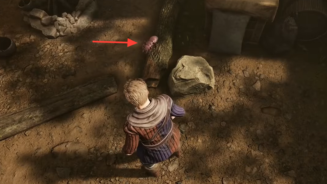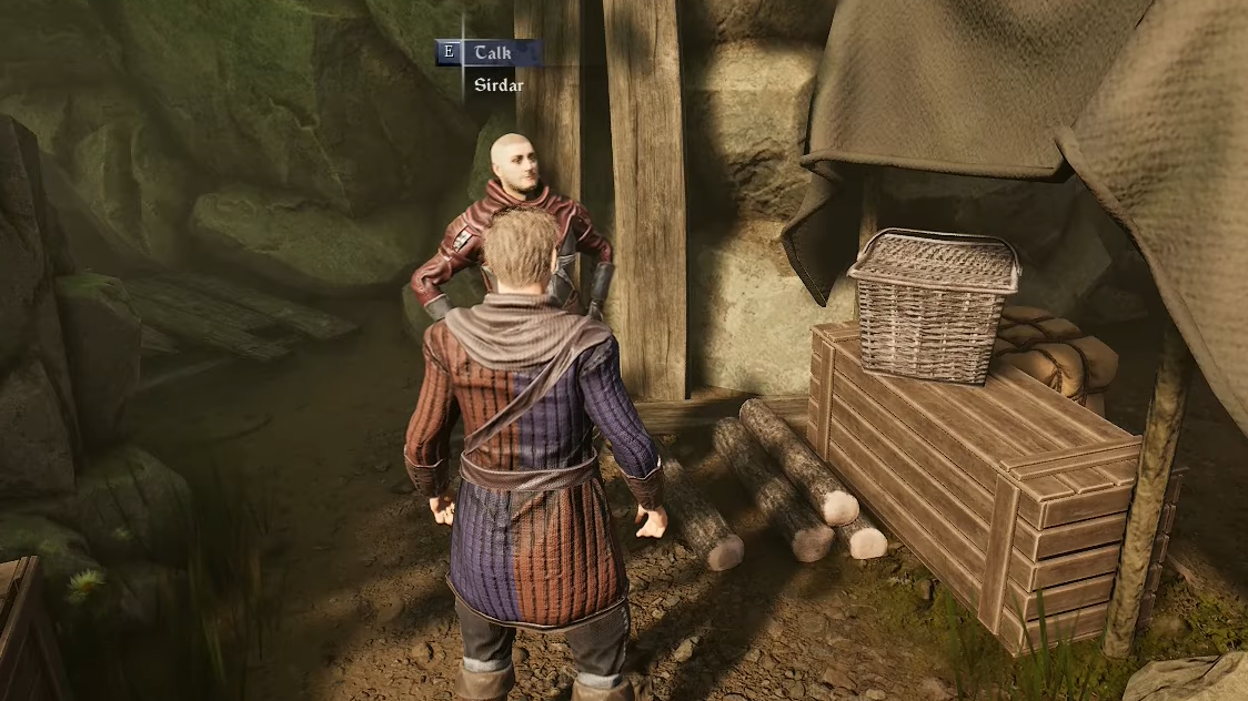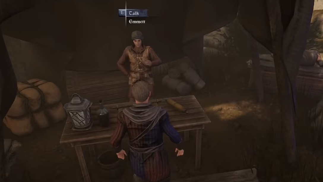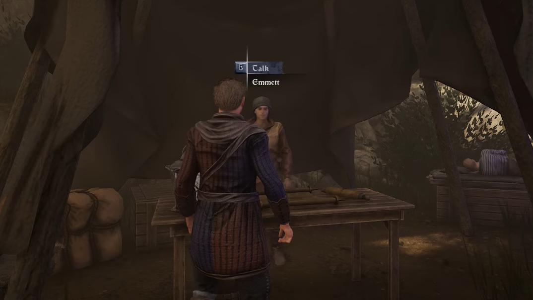 Step 2: From Sirdar’s position, find Emmett. Take the path directly behind Sirdar up into camp, or circle around the tents; Emmett stands in a small makeshift stall, close to some glowing mushrooms that make the spot easy to recognize.