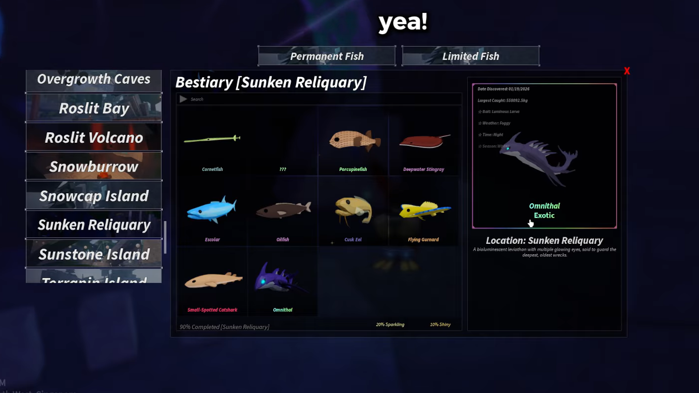 Each Tidefall bestiary has its own exotic fish, and Omnithal occupies that role for the Sunken Reliquary. These exotics are not just collection pieces. Omnithal is used in crafting the Requiem Rod and is also involved in the Tidefall Obelisk puzzle that gates access to the final hunt area.