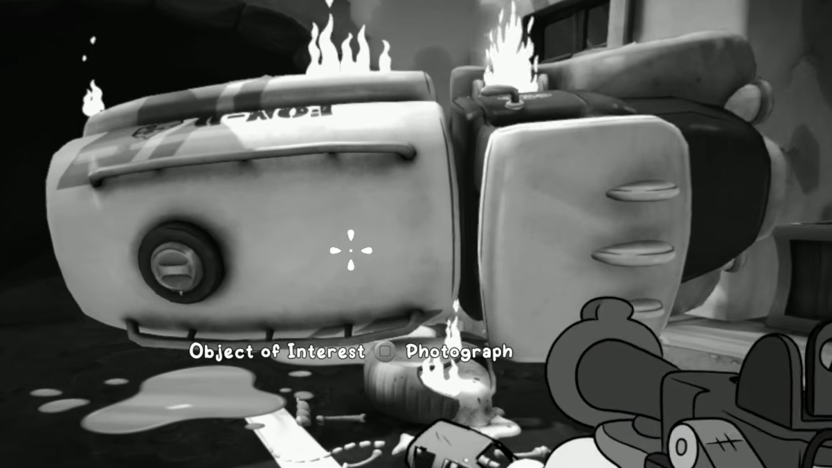 Step 1: Follow the street as it bends east until you reach two overturned vehicles. Photograph the crashed truck at the back as an Object of Interest to register the Truckload of Blue clue.