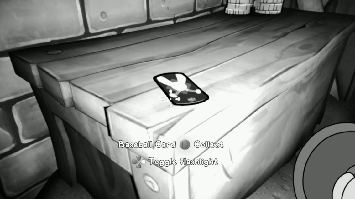 The next room has a typewriter and a "Totally Normal Wall" begging for d-namite. Blow it open, drop down through the dark passage with the flashlight on, and grab the Justin Young Baseball Card on a box in the back-left corner of the lower floor.