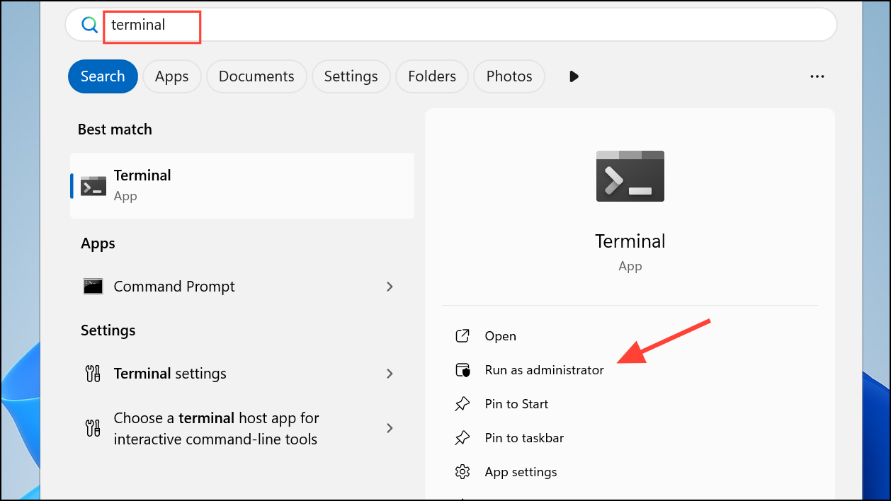 Step 3: In the results, right-click Windows Terminal and choose Run as administrator. Alternatively, click the small arrow next to the app and select Run as administrator from the expanded options.