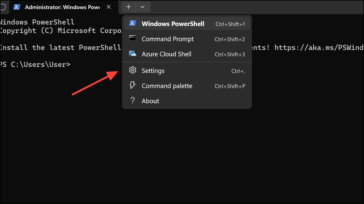 Step 1: Launch Windows Terminal using any method above, then click the downward arrow in the title bar and select Settings, or press Ctrl + ,.