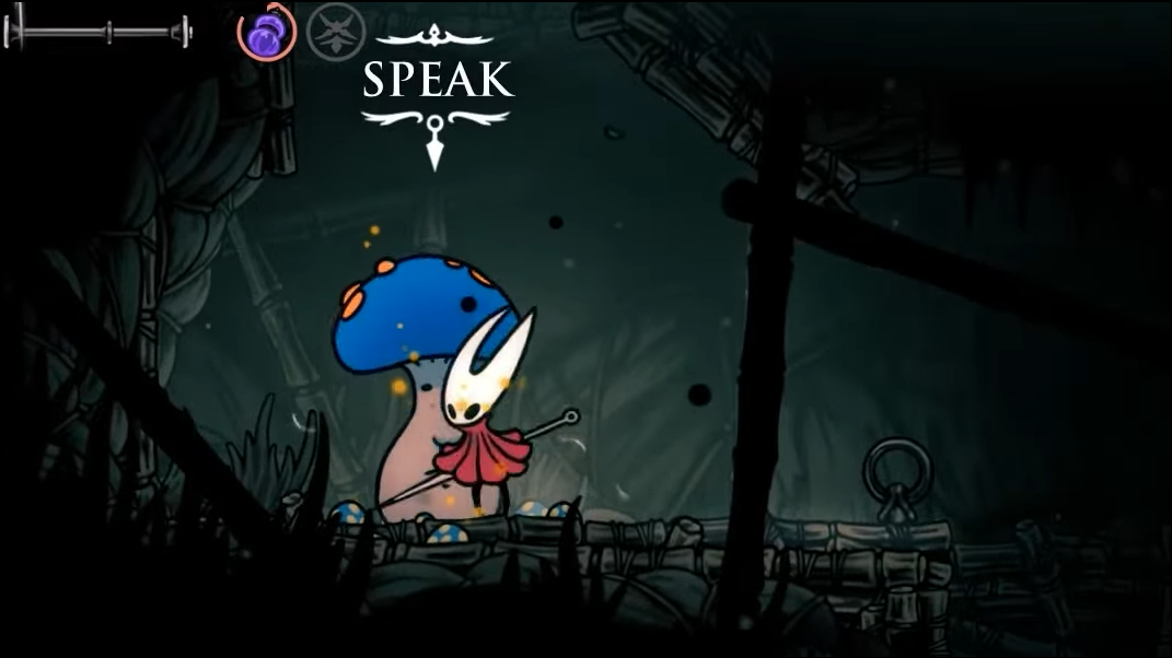 Step 2: Climb to the small platform above and to the left of The Marrow doorway, use Needolin on the mushrooms, then speak to Mister Mushroom.