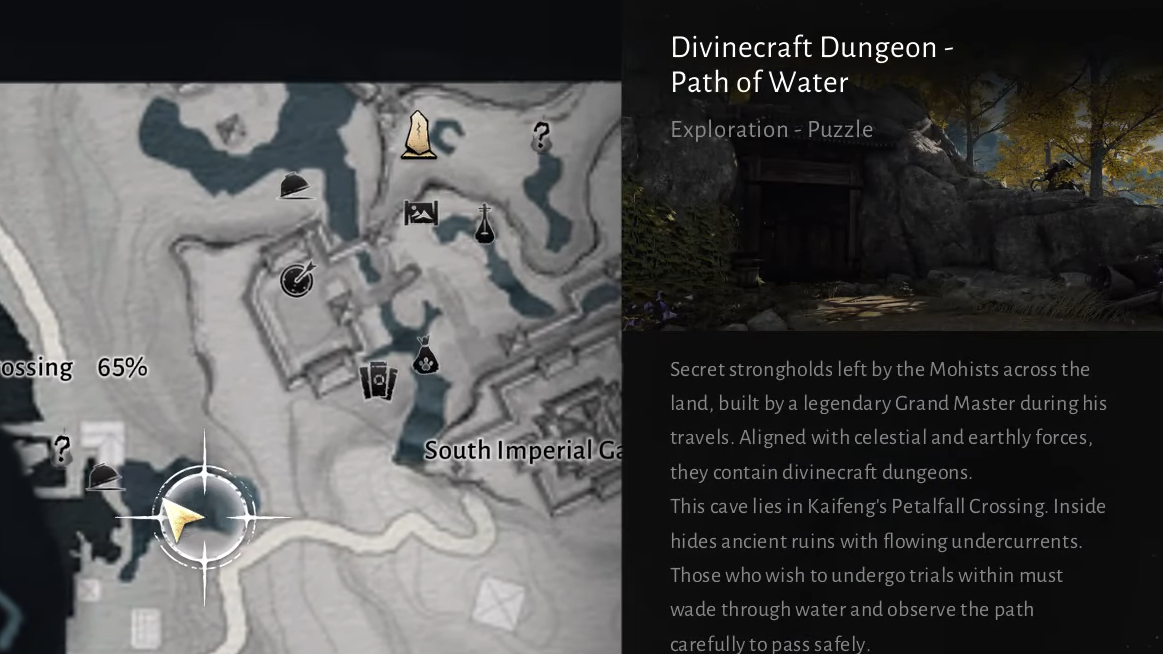 Path of Water is in western Kaifeng, just north-east of the Petalfall Crossing boundary stone. The entrance sits behind a waterfall; step through to find the Divinecraft door, open it, then drop down into the first puzzle room.
