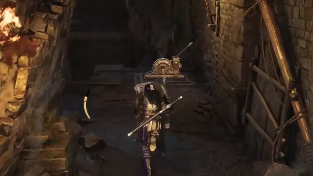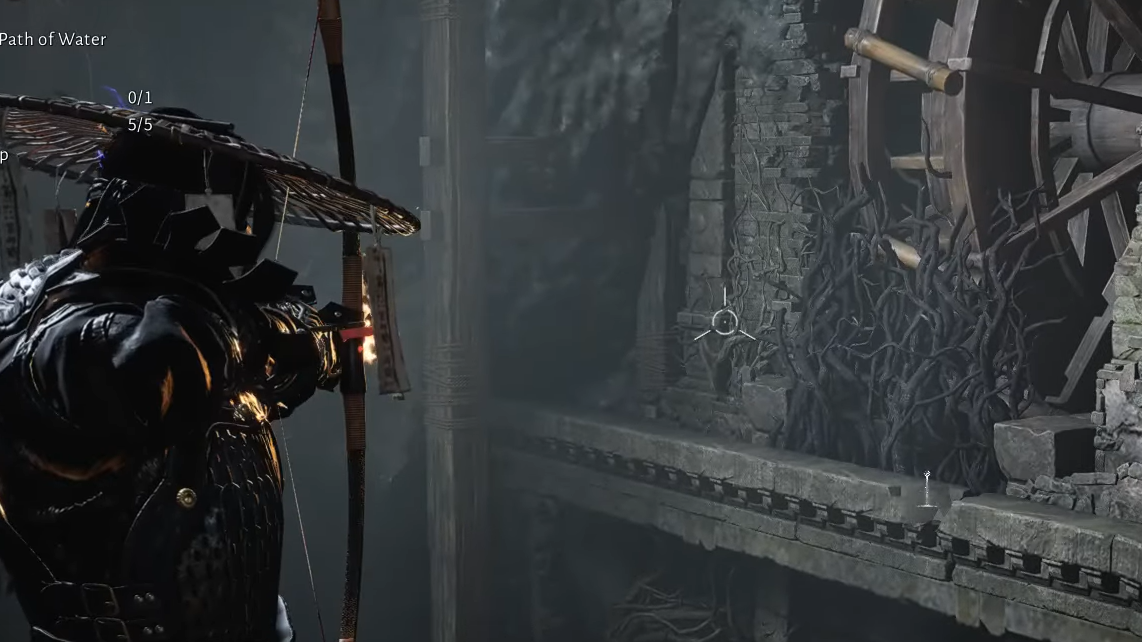 Step 2: Equip fire arrows and find a position with a clear shot. Shoot the vines on the wheel until they burn away, and the mechanism becomes usable.