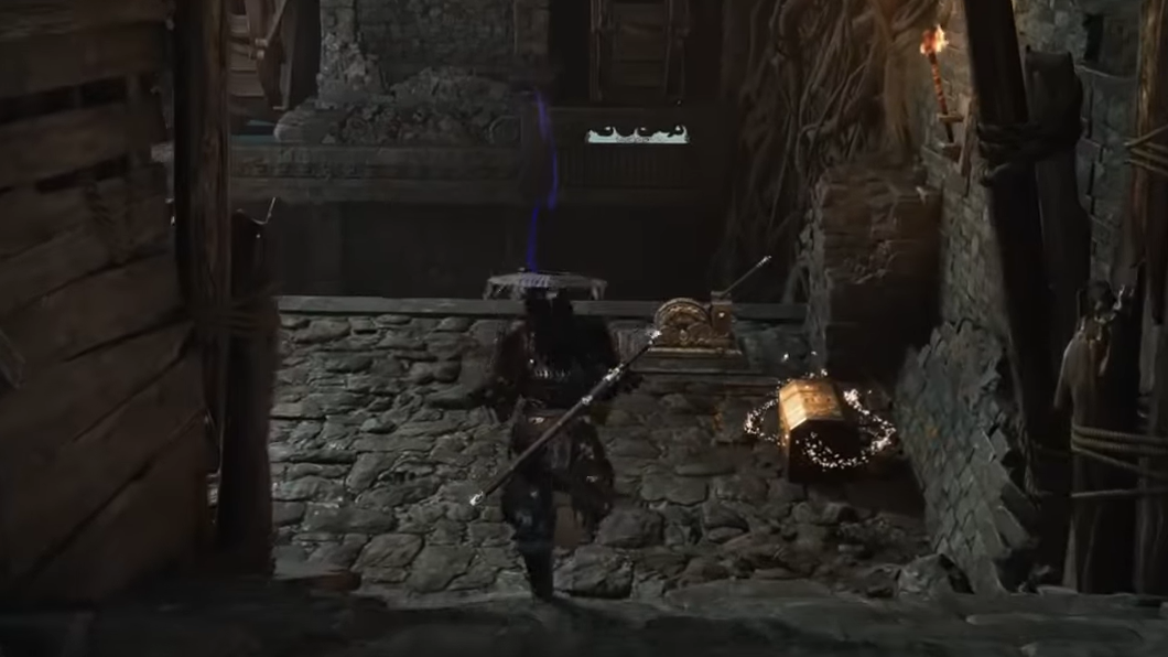 Once you’re back on the upper platform and have opened the bell door with Meridian Touch, go through and down the stairway beyond to reach the 2nd chest.