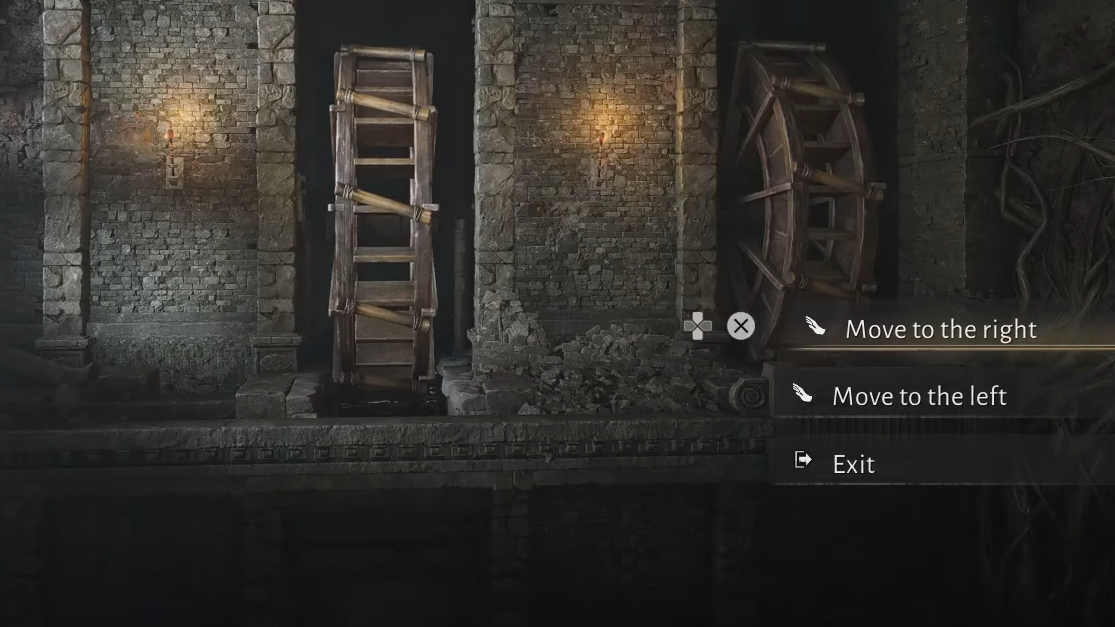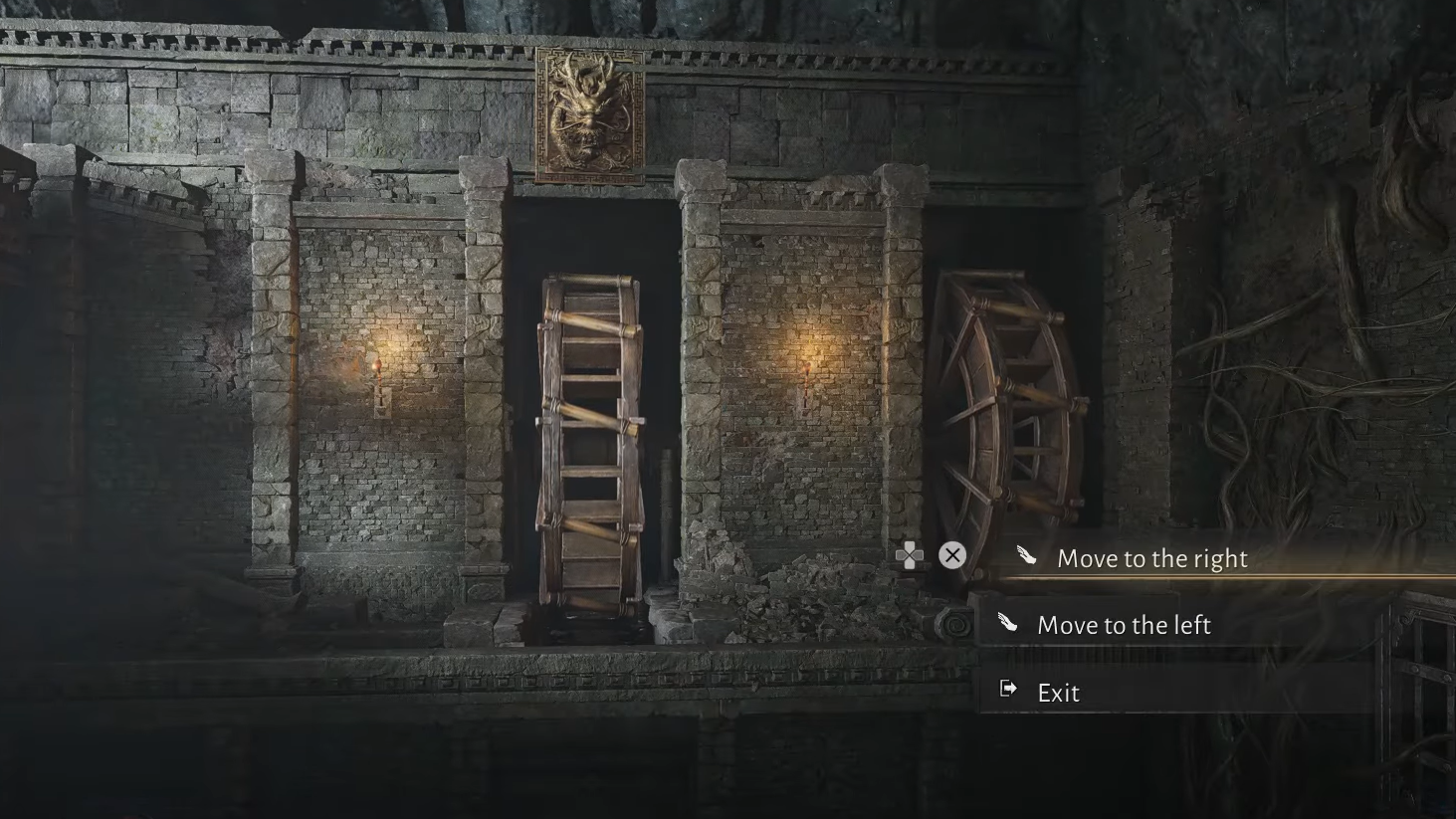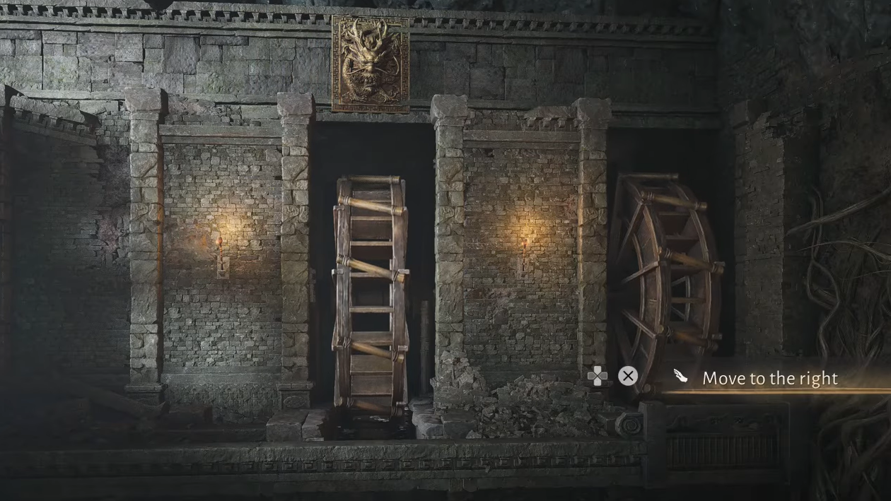 - Water control console + lever: A circular console moves a dragon- or lion-head spout between different waterwheels. A lever then releases water into whichever wheel the spout currently targets. Each wheel controls flooding or draining specific parts of the dungeon.