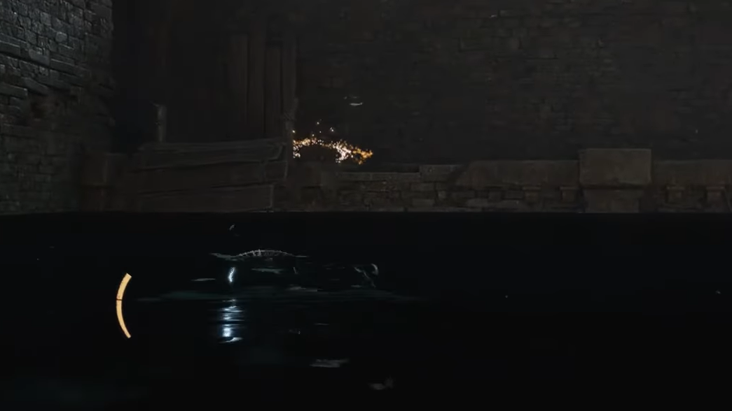 On the far side, behind wooden planks, there is a bell linked to a locked stone door on the lower level. You cannot break the lock while swimming, so the timing and water height matter.