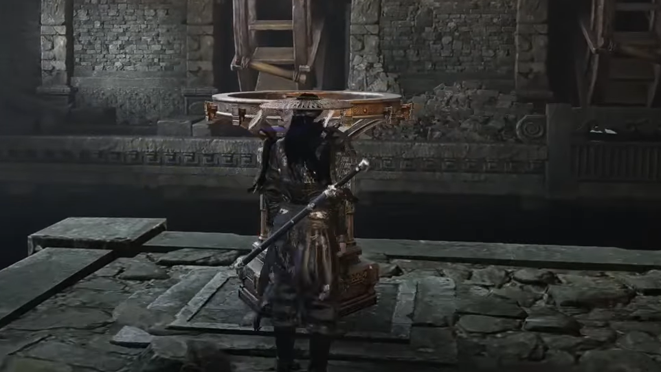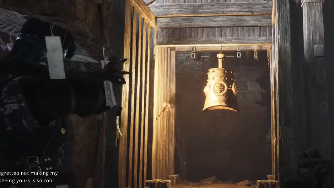 Step 1: Approach the main lever on the upper platform and pull it. A mechanism turns, briefly opening a stone door that reveals a large bell inside.