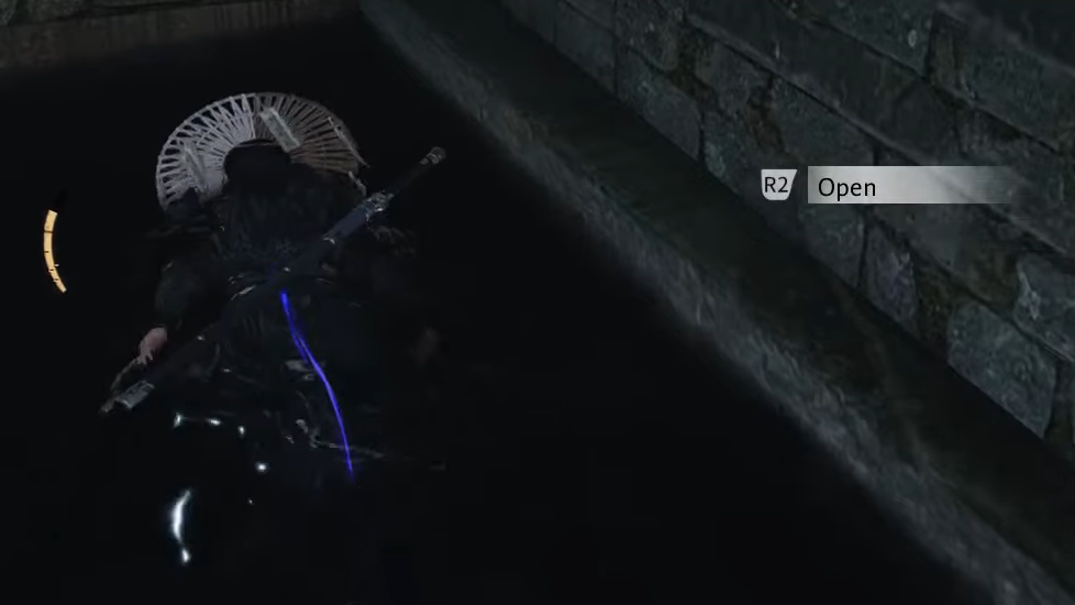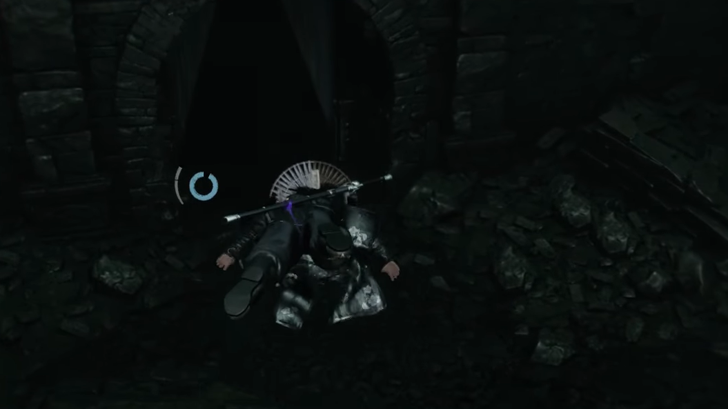 The locked stone door that eventually becomes your underwater passage between rooms still needs to be opened with the familiar bell and Meridian Touch combo. The catch here is line of sight and timing; you need to shoot a bell from atop a broken wall and then quickly get down to the door.