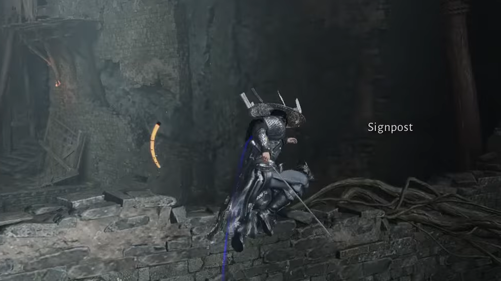 Step 1: In the drained third area, climb the ladder again and jump onto the broken wall that separates the second and third rooms. Stay on the wall; do not drop to the other side.