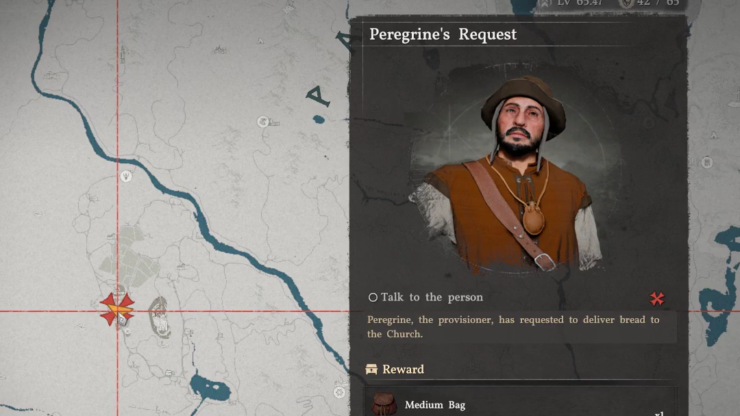 Quick answer: Complete Temir's Request first, then speak to Peregrine at the bakery stall in Hernand, pick up his bread basket, and deliver it to the caretaker near the altar inside the Church of Hernand. You'll receive a Standard Inventory Expansion Tool and 2× Barley.
