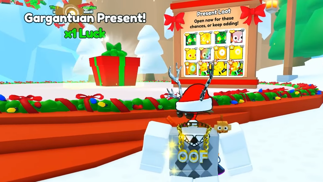 - The Gargantuan Present, which can contain pets like the Gargantuan Elf Golem and the Titanic Gingerbread Angelus.