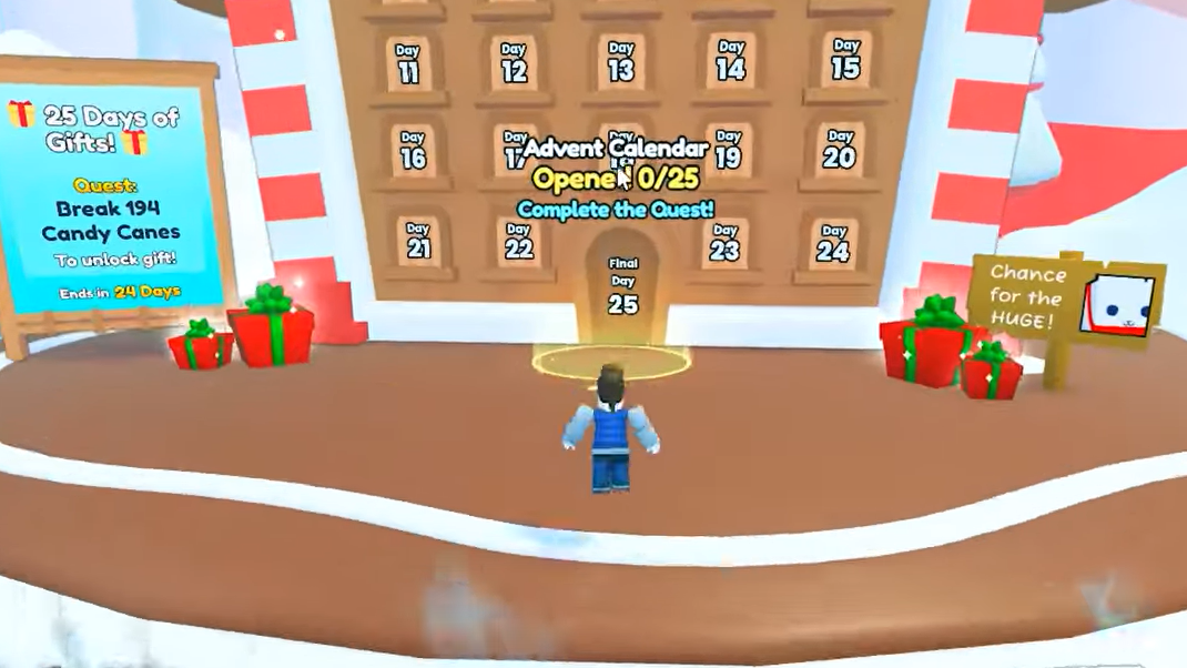 Elf on a Shelf is deliberately lighter and more predictable than those modes. It asks for a short daily hunt, rewards you with a clean “you have unlocked extra Huge rolls” outcome, and nudges you to re-engage with the rest of the Christmas loop while you are already in Holiday World looking for a green pet hiding behind a tree.