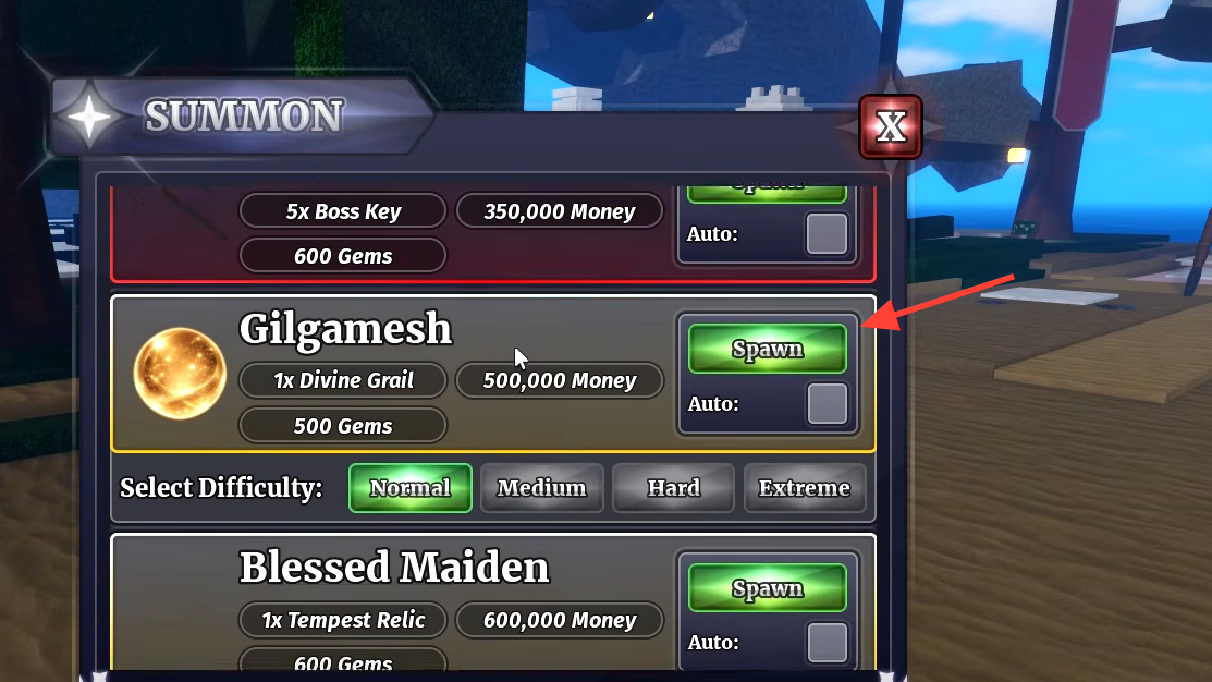 Step 3: Click the Spawn button. Gilgamesh will appear on Boss Island, and you can engage immediately.
