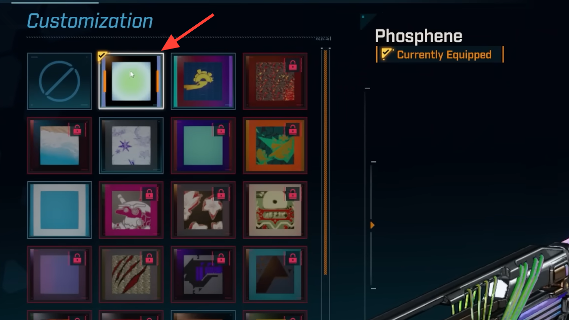 - From then on, any instance of that gun can be manually given the Phosphene appearance in its customization menu.