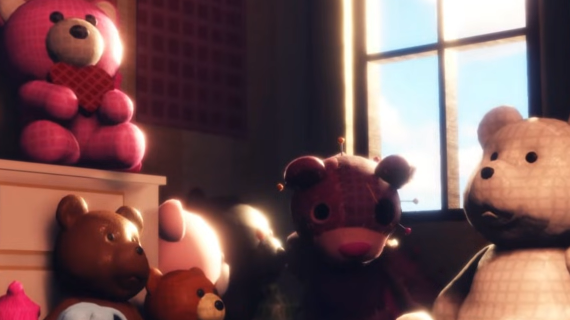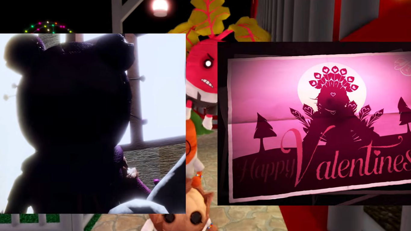 The March 4 announcement video runs about 40 seconds and features a room decorated with teddy bears. A beach ball rolls into the scene, and a poster of the Valentine's Peacock is visible in the top-left corner. The room then goes dark, and one of the teddy bears — a violet one positioned next to a white bear — starts moving, sprouting hands and revealing the black creature inside it. The footage glitches before displaying a "coming soon" title card.