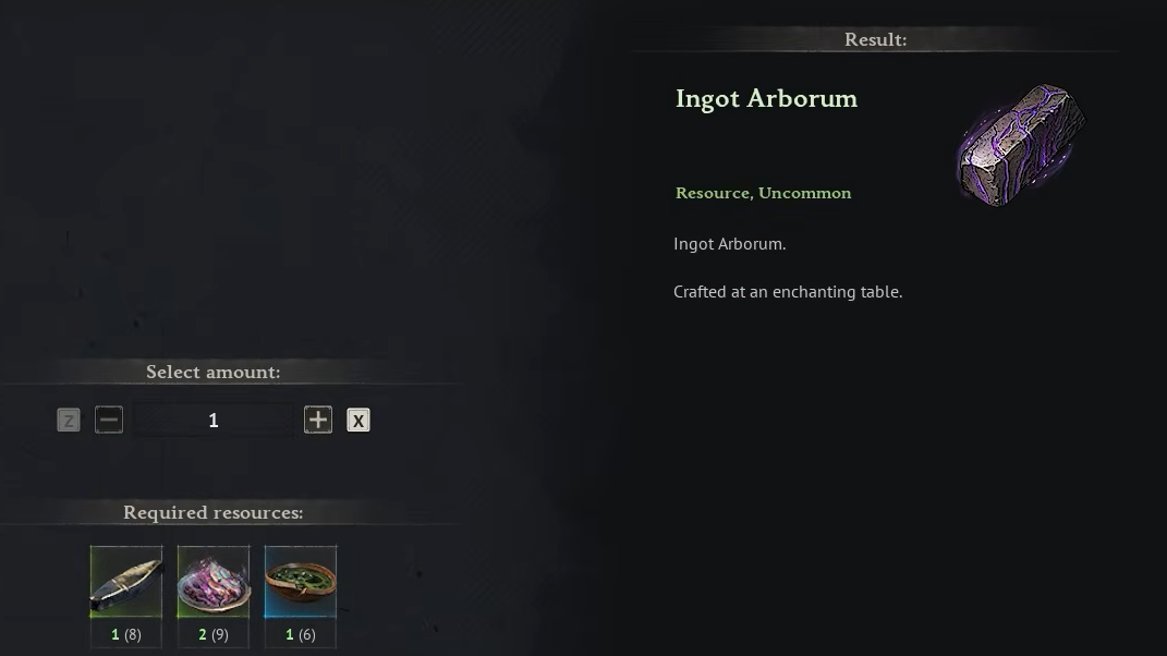 Step 4: At the Enchanting Table, combine 1 Mire Metal Ingot, 2 Essence Arborum, and 1 Tainted Bile to produce 1 Ingot Arborum.
