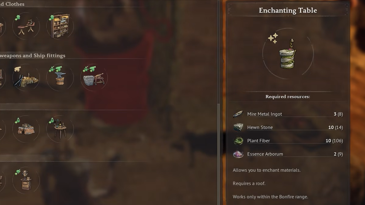 Step 3: Build the Enchanting Table from the Refining section of the Building Menu. It requires 3 Mire Metal Ingots, 10 Hewn Stone, 10 Plant Fiber, and 2 Essence Arborum.