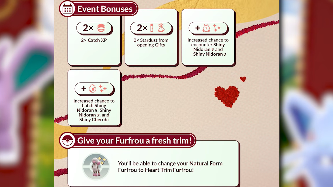Quick answer: The event grants 2× XP for catches, 2× Stardust from gifts, increased shiny rates for Nidoran and Cherubi, and lets you change Furfrou to Heart Trim form for 25 Candy and 10,000 Stardust.