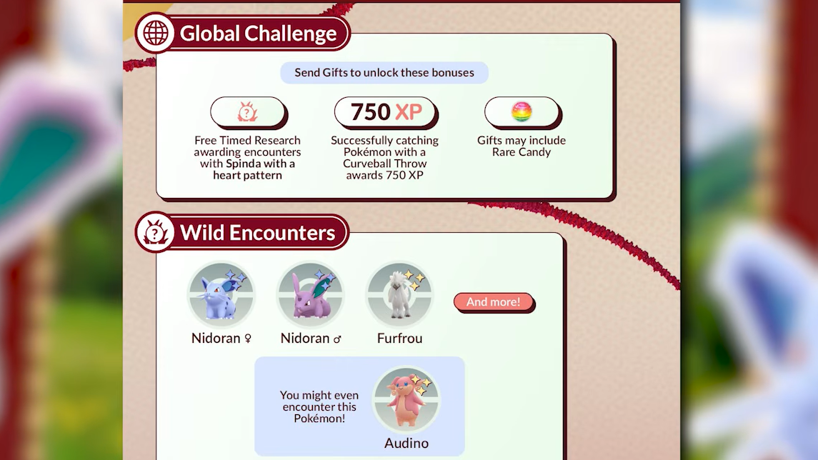 Event-themed Field Research tasks become available at PokéStops. Completing these tasks grants encounters with event-themed Pokémon, offering additional chances to catch Nidoran, Furfrou, and other featured species. Specific task details are not confirmed in advance, so check your available tasks once the event begins.