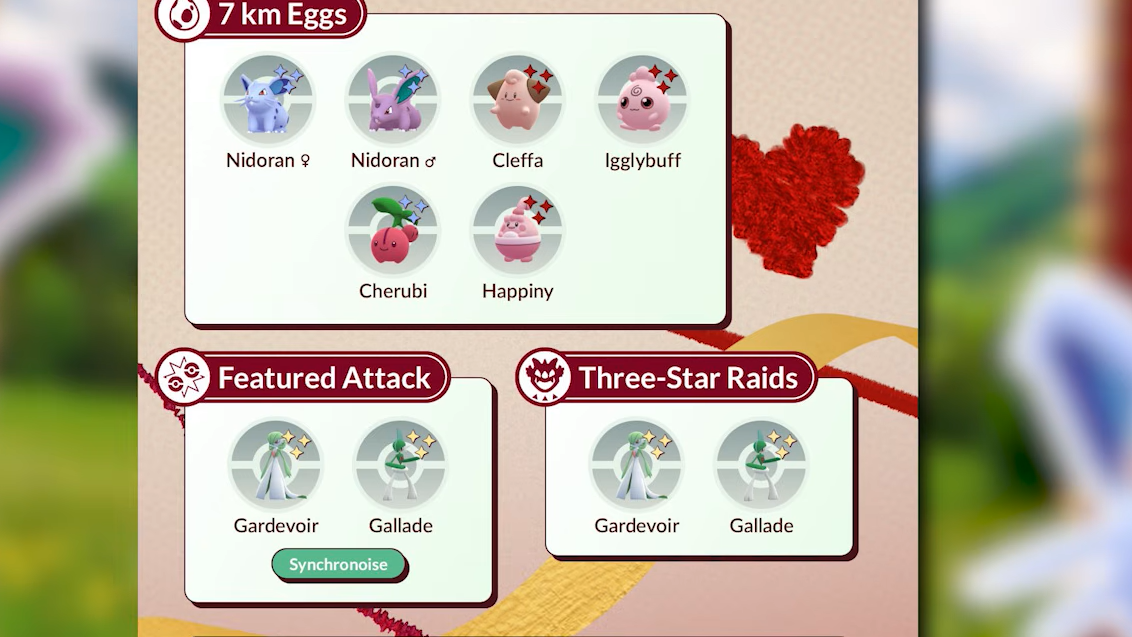 The Valentine's Day event emphasizes gift-giving and romance-themed Pokémon. Prioritize catching Nidoran for the shiny variants and XP bonuses, hatch 7 km eggs for baby Pokémon, and participate in raids for Gardevoir or Gallade with Synchronoise if you plan to use them competitively. If you have a Furfrou and want the Heart Trim form, complete the transformation before February 15 at 8:00 PM local time, as the option disappears when the event ends.