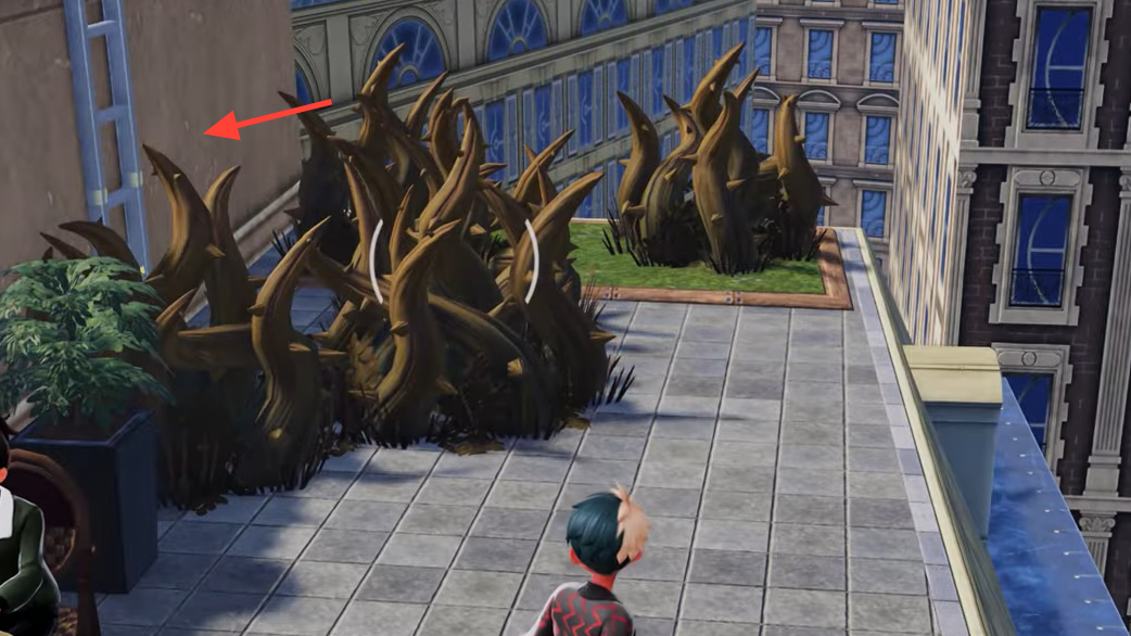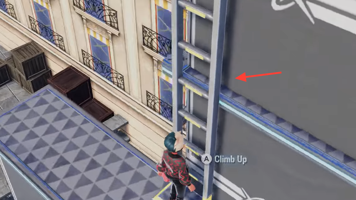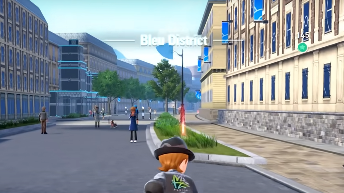 Look for scaffolding to the left of the truck and start climbing. You’re aiming for the rooftop in Bleu Sector 7, just to the right of the Bleu Pokémon Center: