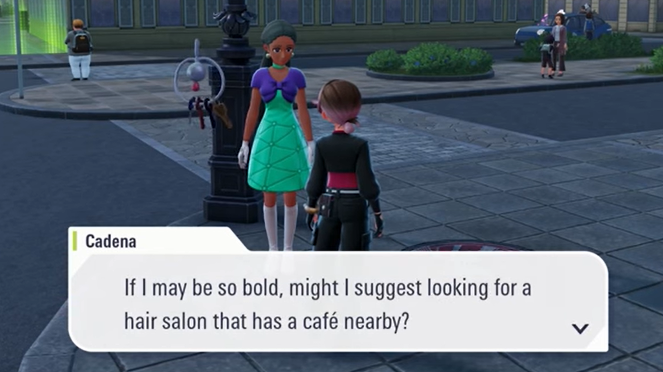 Open your side missions and track “Klefki’s Lost Key,” then speak to Cadena on North Boulevard in the Rouge District. She’s positioned across from Hotel Richissime. Cadena explains she visited a hair salon and a café, then used a nearby battle court — and somewhere along that path, her Klefki dropped a key.