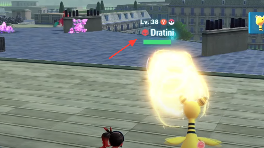 Dratini doesn’t live in the Wild Zones in Pokémon Legends Z‑A. It spawns on rooftops around Lumiose City, most reliably during the day. While it can appear on several buildings, one rooftop is consistently worth the trip: the roof of Restaurant Le Nah in the city’s eastern side. Reaching it is a short platforming sequence, and once you’re up there you’ll see Dratini idling on a raised section of the roof.