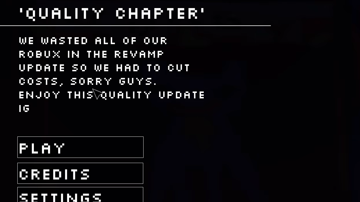 Pop Playtos Quality Chapter is a special event chapter in the Roblox Poppy Playtime-inspired game Pop Playtos. The chapter presents itself as a deliberately low-quality experience, with a menu description explaining that the developers "wasted all of our Robux in the revamp update so we had to cut costs." Despite the comedic framing, the chapter includes puzzles and interactive elements that require specific solutions to progress.