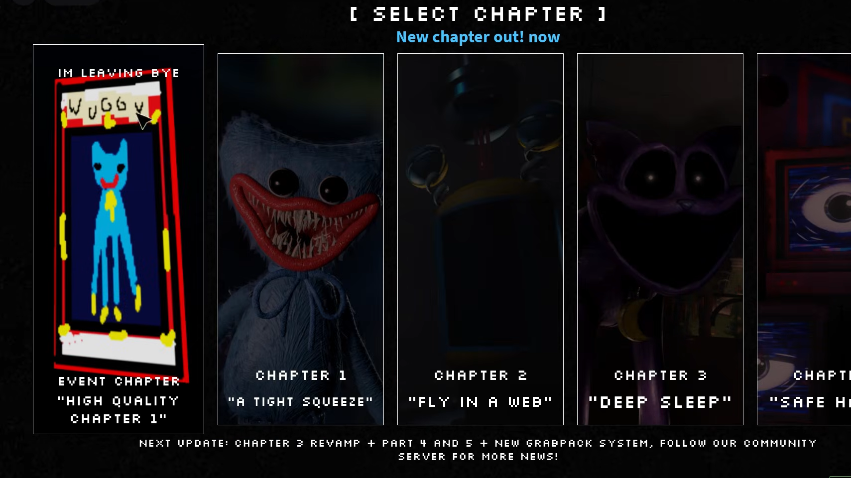 The Quality Chapter is a short event experience designed as a humorous interlude between major content updates. The chapter select menu displays a notice at the bottom stating "NEXT UPDATE: CHAPTER 3 REVAMP + PART 4 AND 5 + NEW GRABPACK SYSTEM, FOLLOW OUR COMMUNITY SERVER FOR MORE NEWS!" This indicates that the main game continues to receive regular updates with revamped chapters and new mechanics.