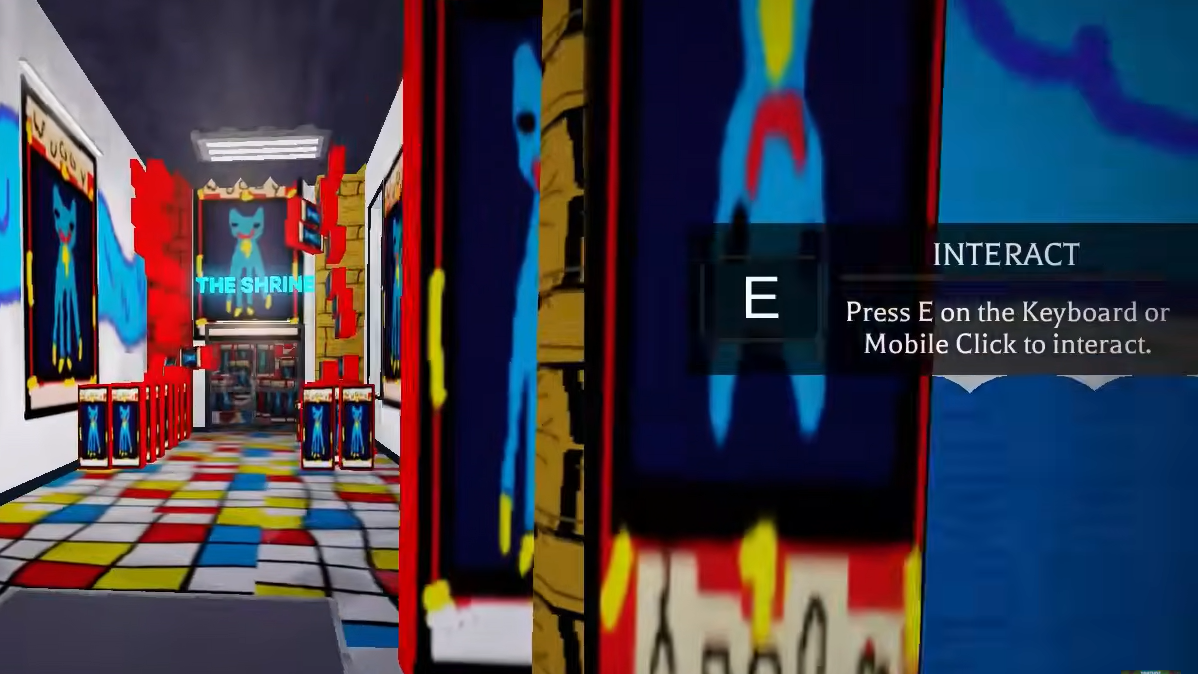 The game uses standard Roblox interaction mechanics. When you approach a door or interactive object, an on-screen prompt appears displaying "INTERACT Press E on the Keyboard or Mobile Click to interact." Press the E key on the keyboard or tap the screen on mobile devices to open doors and activate objects.