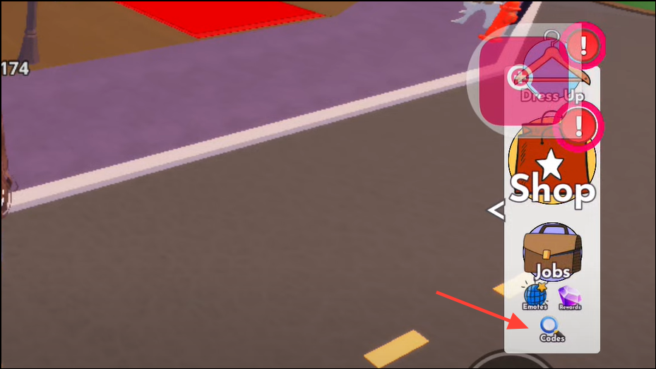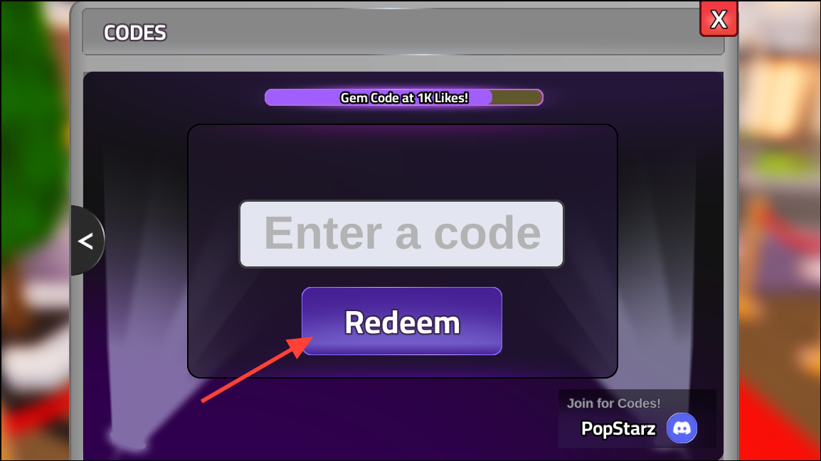 Step 3: Click the Codes button on the right side of the screen to open the redemption window.